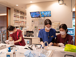本院では、手術室や回復室(麻酔から覚めた後にお休みいただく専用ルーム)といった設備、病院レベルの手術用機材を揃えており、インプラント手術や静脈麻酔(鎮静薬を点滴することでリラックスして治療を受けられる麻酔方法)が必要な高度な外科手術の対応が可能です。 鎮静麻酔が必要な症例に対しては、本院と連携をとり、病院レベルの治療を安心して手軽にお受けいただけるよう体制を整えております。